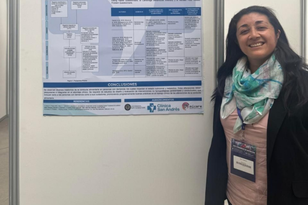 Clínica San Andrés felicita a Fabiola Aravena por su participación en SOCHINUT 2025, donde presentó su investigación “Trastornos de la conducta alimentaria en personas con demencia: Revisión de alcance”. Este trabajo, desarrollado desde su experiencia clínica y como tesis de su Magíster en Nutrición en Salud Pública, aborda cómo el deterioro cognitivo influye en los hábitos alimentarios, afectando el estado nutricional y resaltando la necesidad de mejores herramientas de evaluación e intervención para pacientes y cuidadores